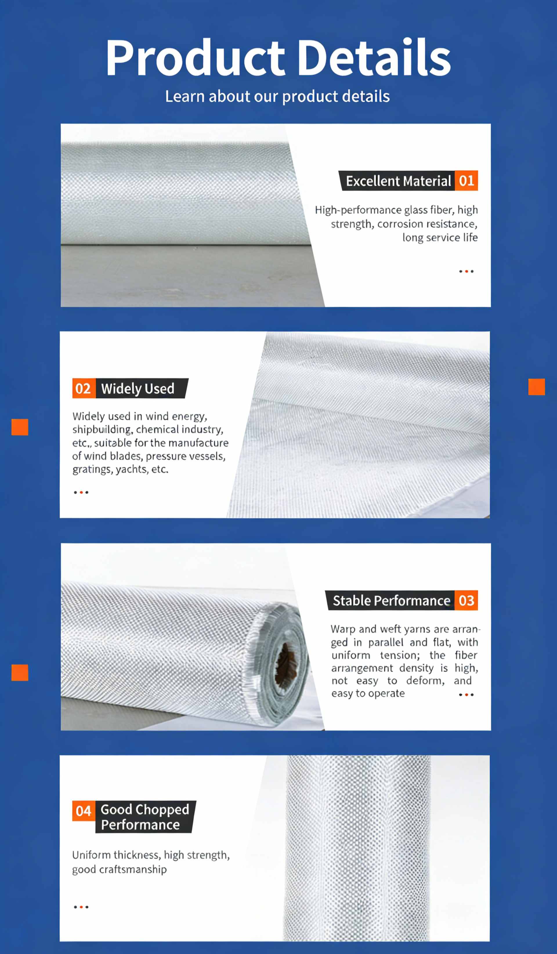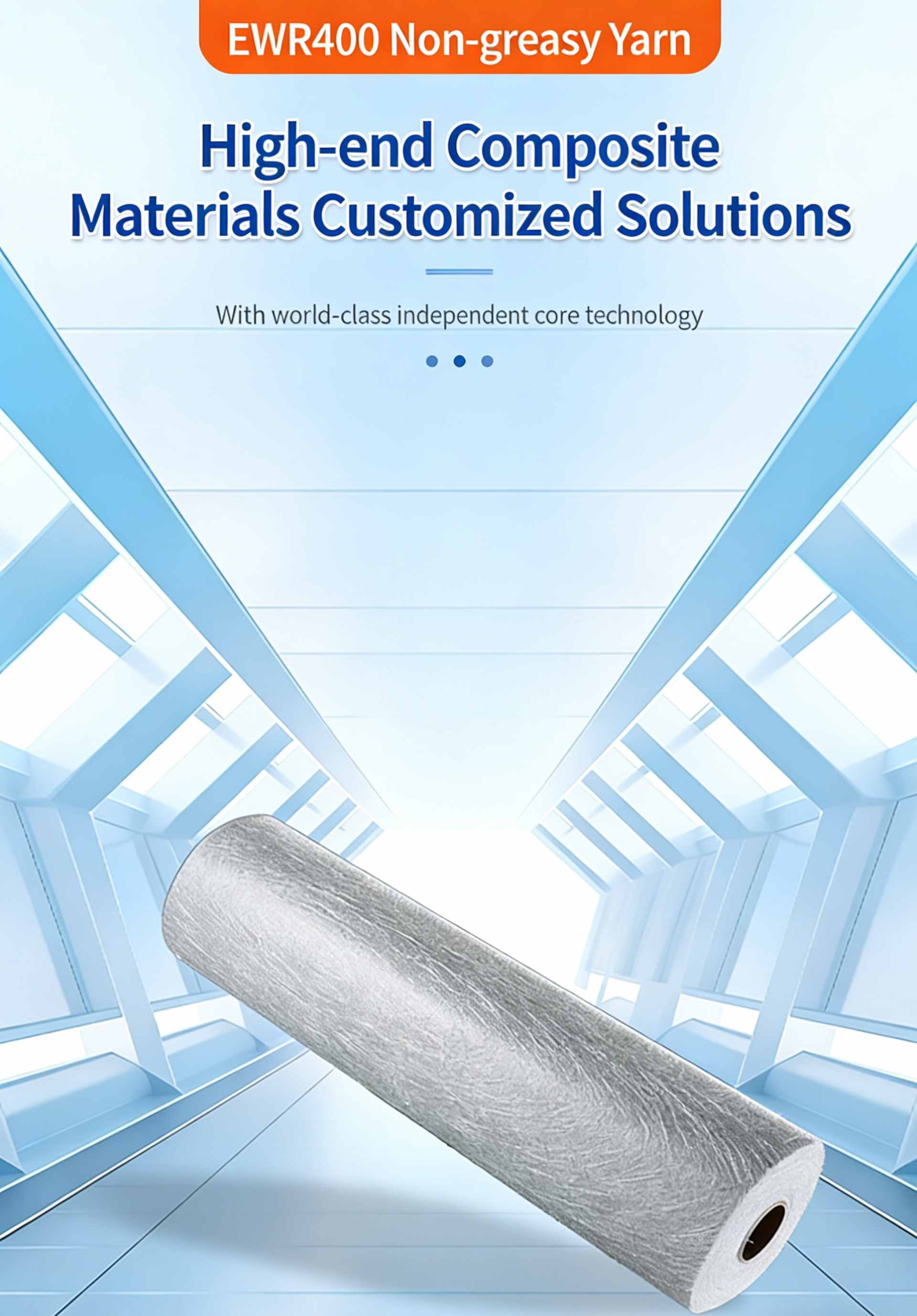 Product Name:EWR400 Untwisted Roving (Rough Roving) Product SKU:JSWX009 Product Compatibility:Compatible with UP/E/EP/PF resin systems, specifically designed for reinforcement applications. Product Specification:EWR400-100 Key Features & Benefits 1.Uniform Fiber Arrangement: Warp and weft yarns are arranged in parallel in a flat shape, ensuring even tension distribution. 2.High Dimensional Stability: High fiber packing density provides excellent resistance to deformation and ease of handling during processing. 3.Excellent Resin Impregnation: Good film-adhering properties enable fast and complete wet-out in resin matrices, significantly boosting production efficiency.