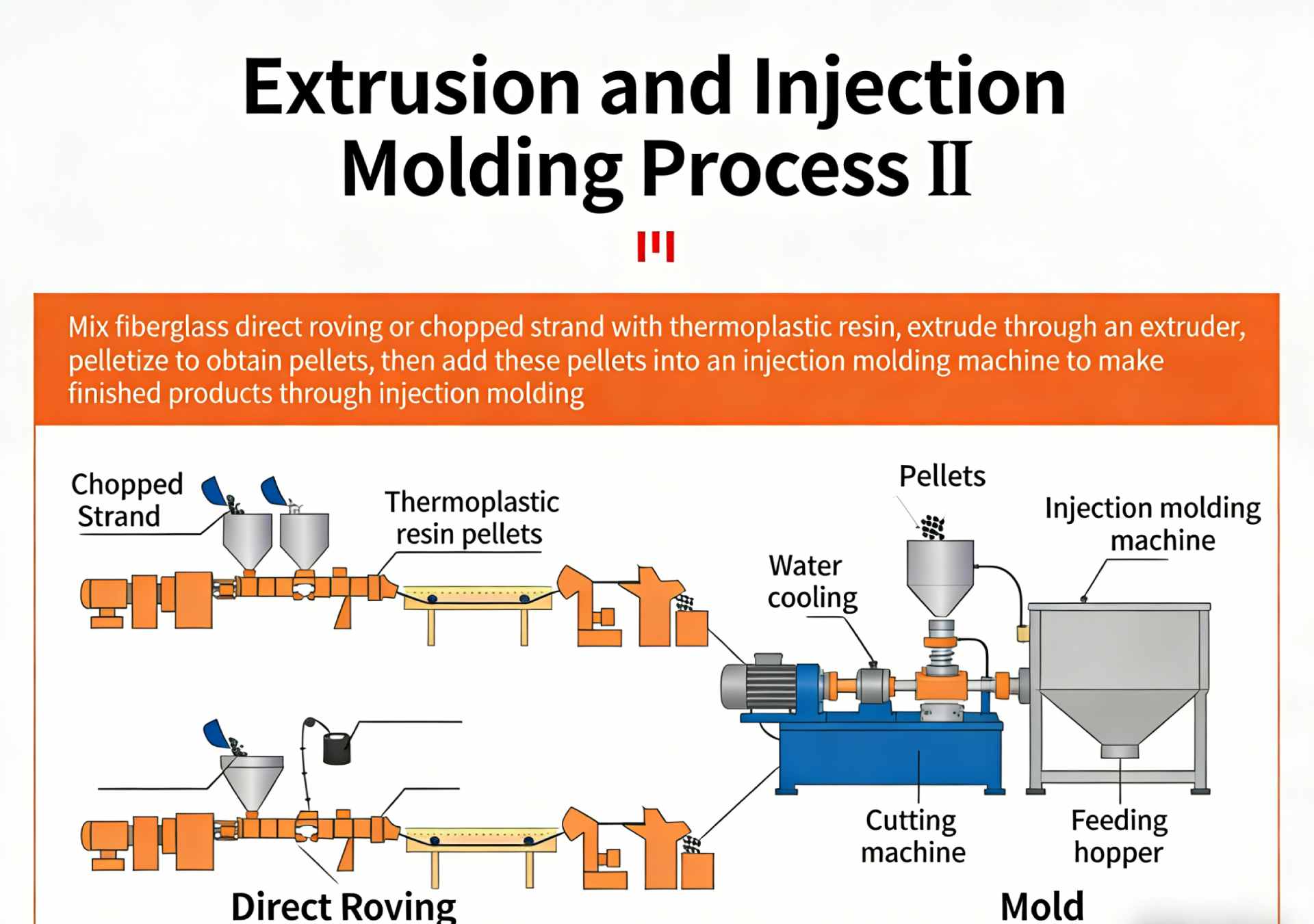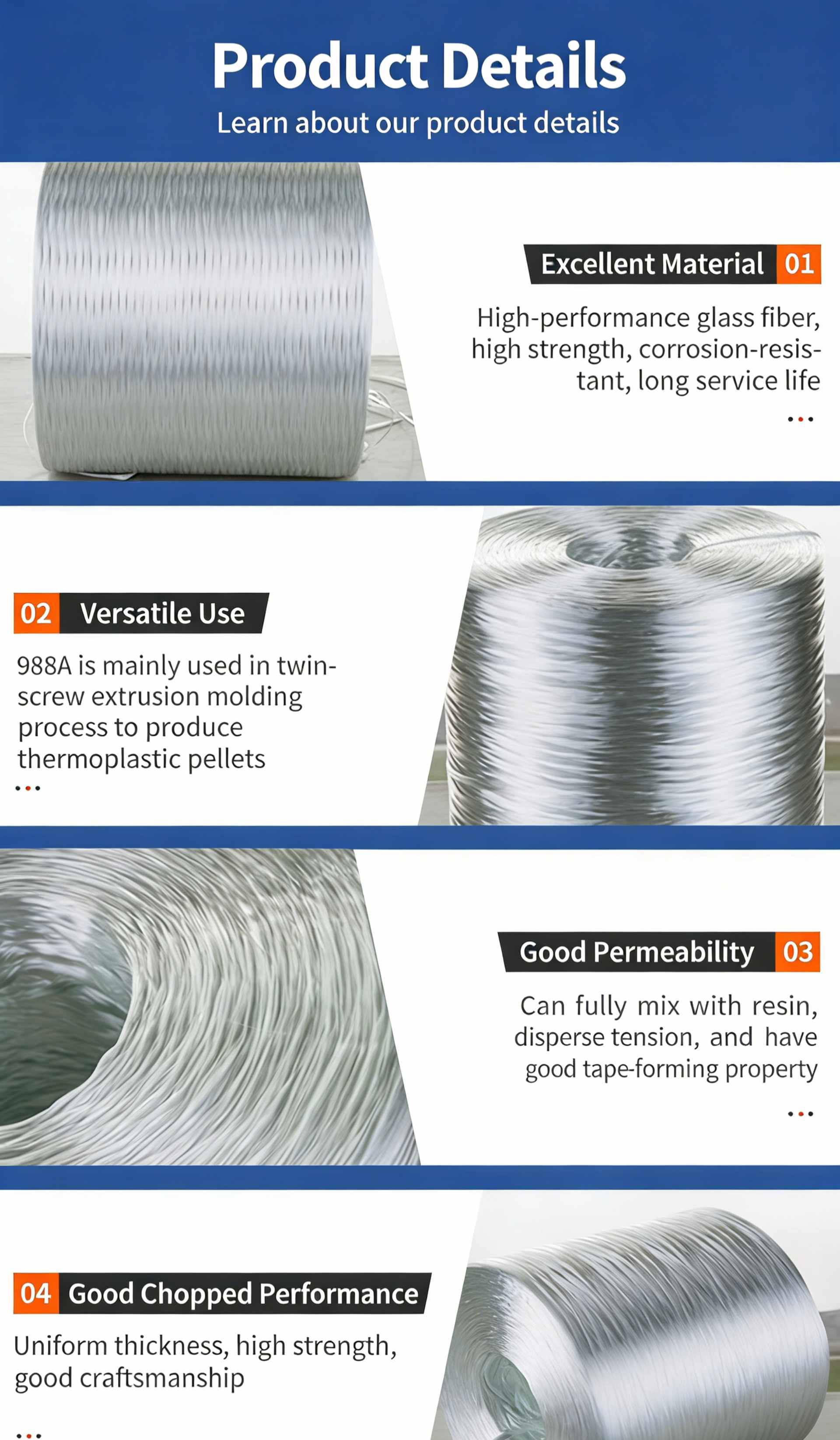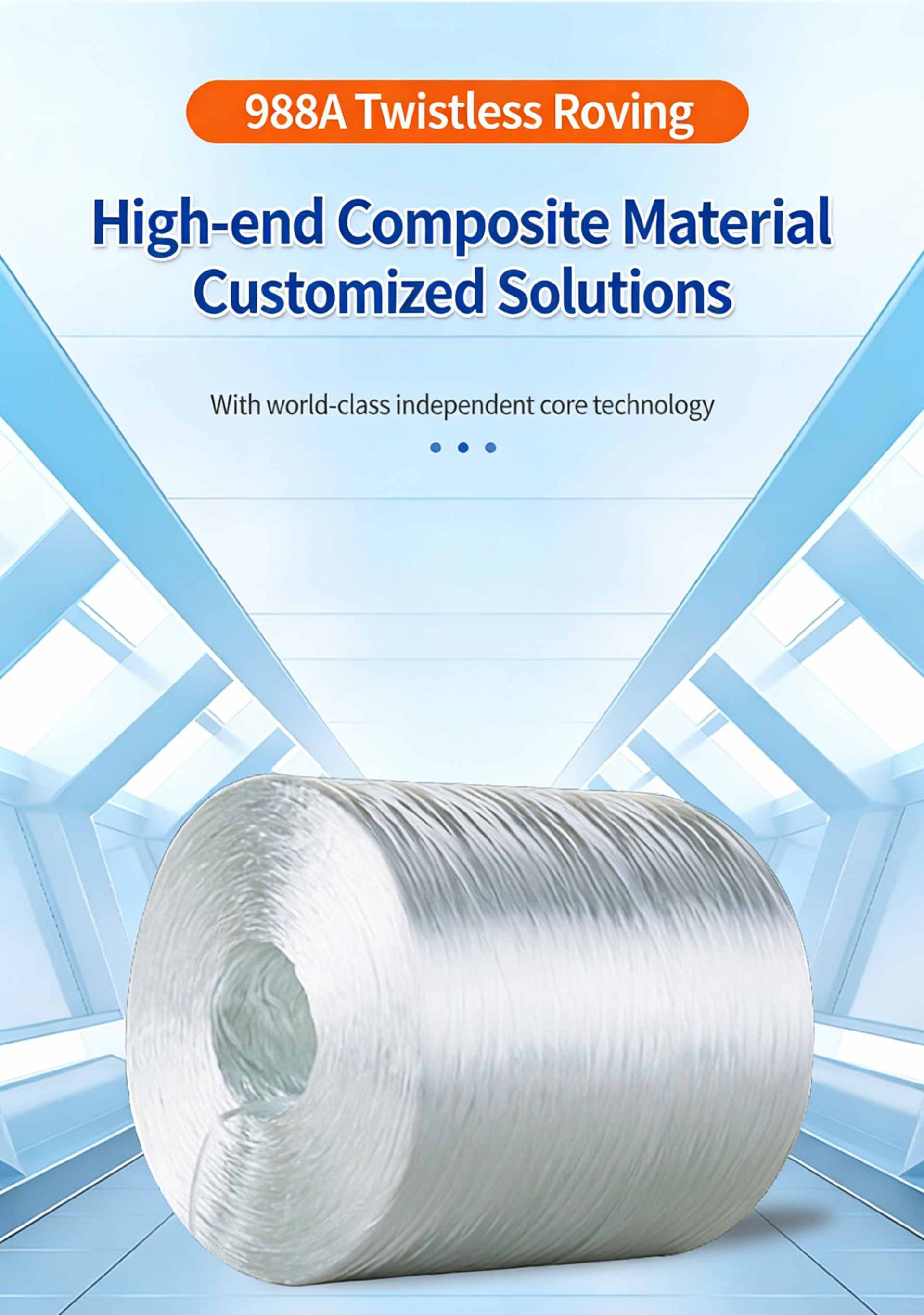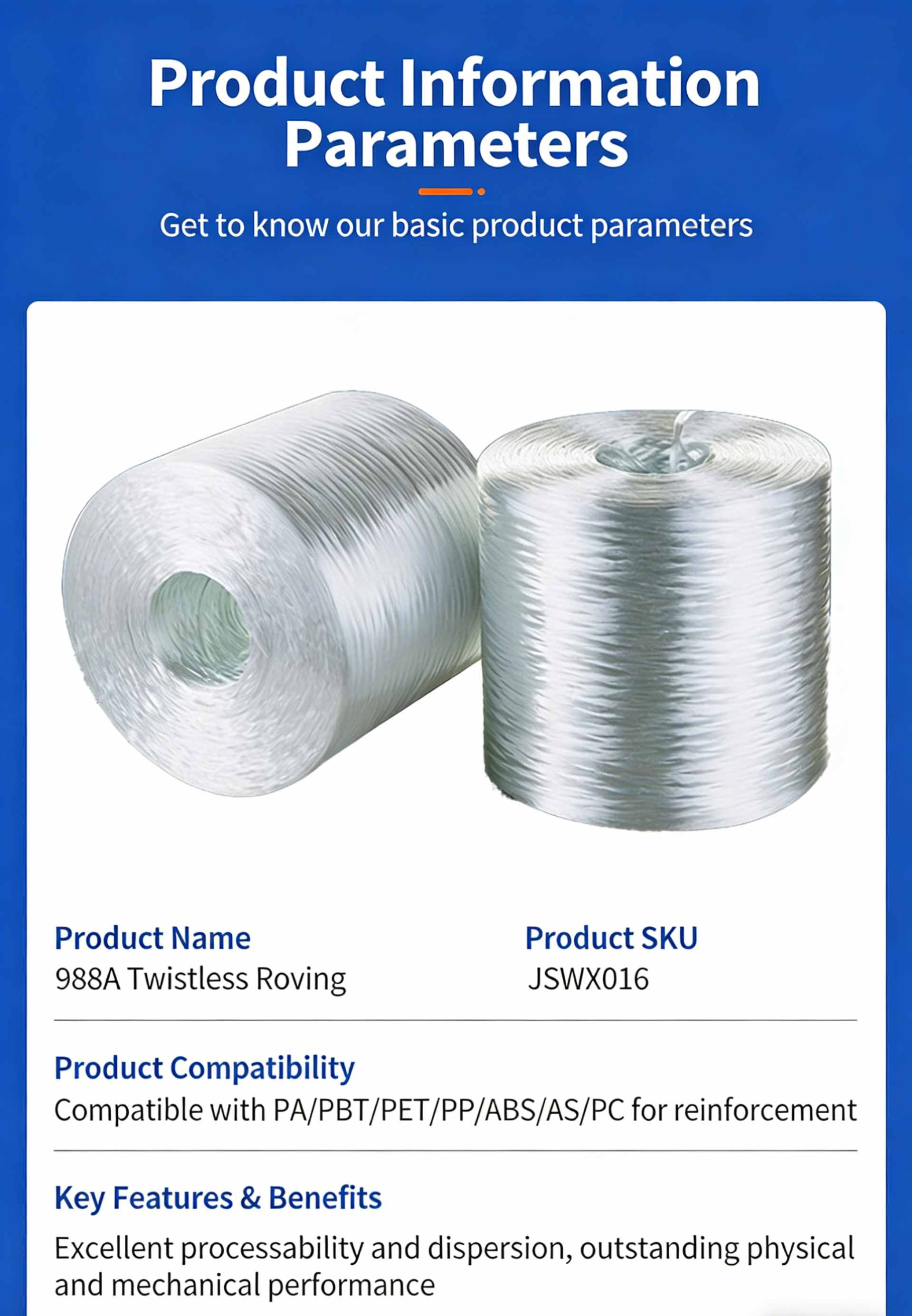 Product Name:988A Twistless Roving Product SKU:JSWX016 Product Compatibility:Compatible with PA, PBT, PET, PP, ABS, AS, and PC thermoplastic polymers for reinforcement applications. Key Features & Benefits 1.Excellent Processability: Ensures smooth production flow and easy handling during compounding and molding. 2.Superior Dispersion: Delivers uniform fiber distribution within the polymer matrix, avoiding agglomeration for consistent part quality. 3.Outstanding Physical & Mechanical Performance: Enhances the strength, stiffness, and durability of the final thermoplastic composite components.