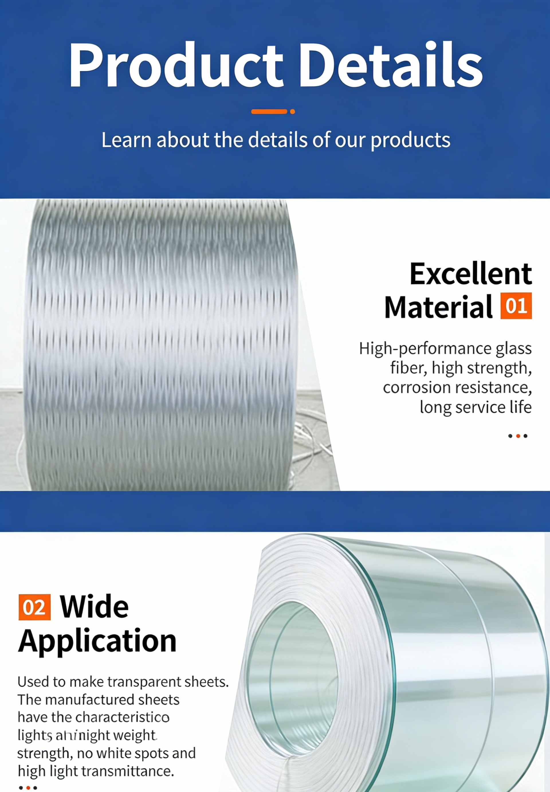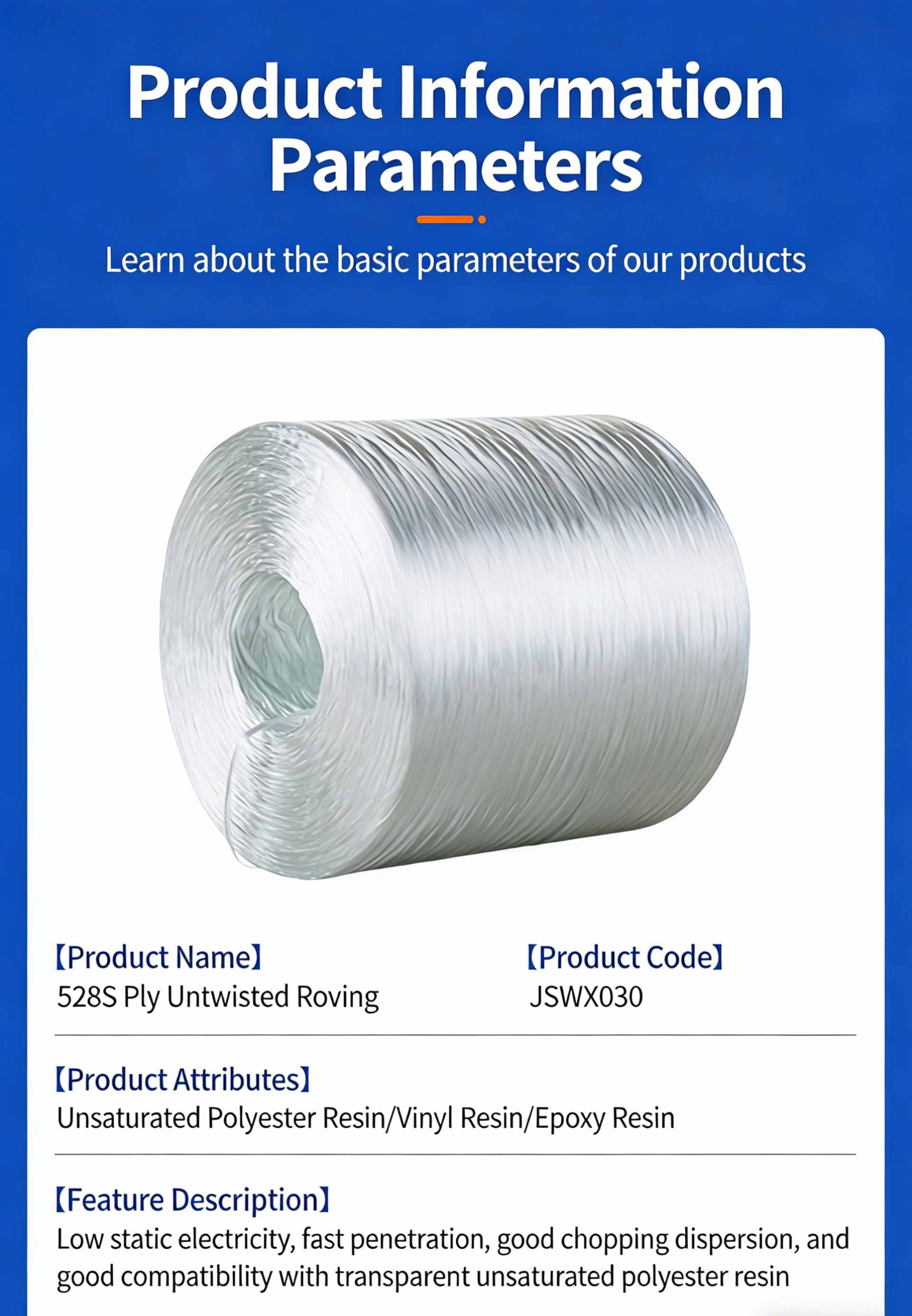 Product Name: 528S Ply Yarn Direct Roving Product SKU: JSWX030 Product Compatibility:Compatible with unsaturated polyester resin, vinyl ester resin, and epoxy resin systems. Key Features & Benefits 1.Low Static Generation: Reduces fiber fly and improves handling efficiency during production. 2.Fast Resin Impregnation: Shortens processing cycles and ensures uniform resin distribution. 3.Excellent Chopping & Dispersion: Delivers consistent fiber dispersion for high-quality composite parts. 4.Superior Resin Compatibility: Optimized for transparent unsaturated polyester resins, ensuring excellent clarity and mechanical performance in finished products.