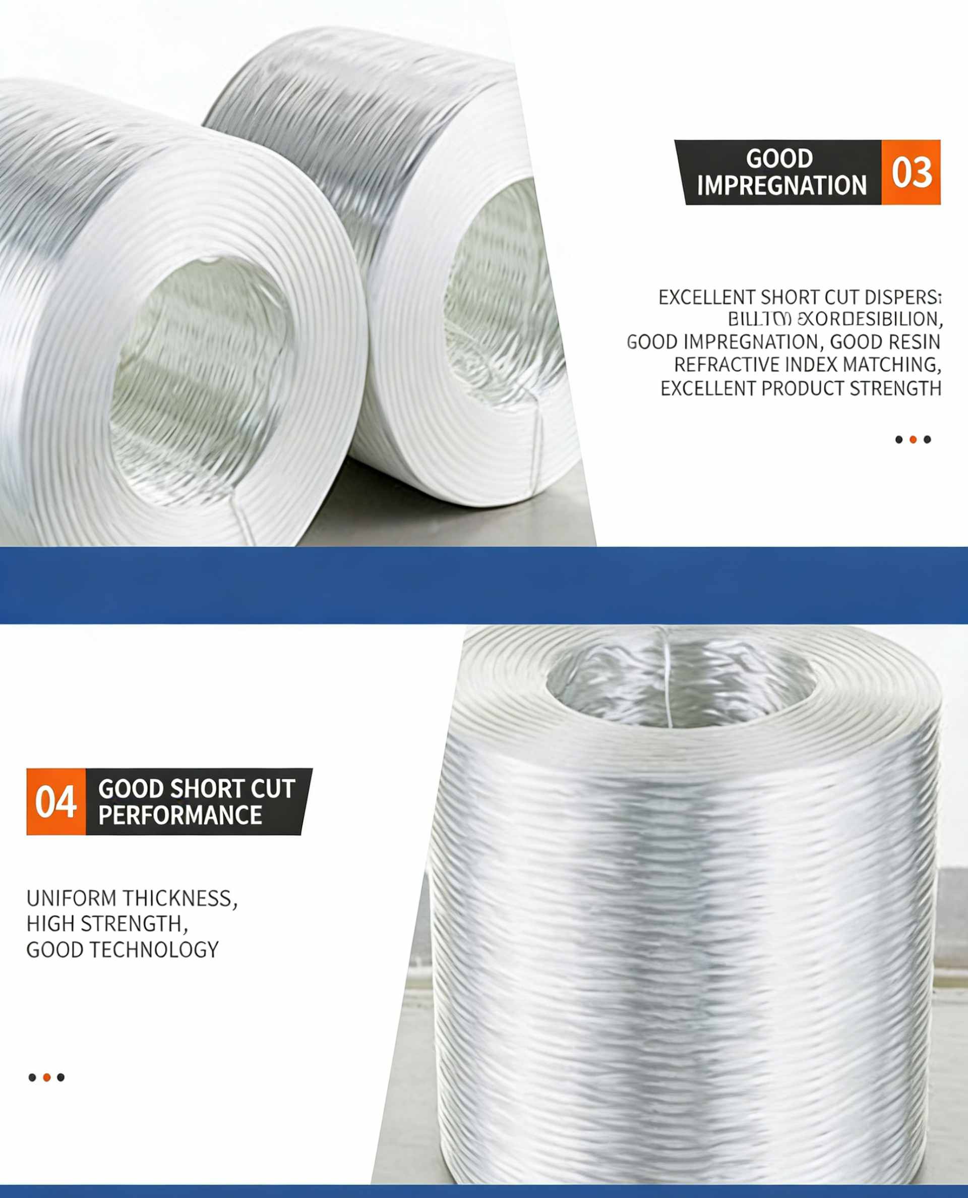 Product Name: 512 Ply Untwisted Direct Roving (Chopping Grade)Product SKU: JSWX030 Product Compatibility: Compatible with Unsaturated Polyester Resin / Vinyl Ester Resin / Epoxy Resin systems, engineered for chopped strand mat manufacturing.Product Specification: ER12-2400-512 Key Features & Benefits 1.Versatile Mat-Making Grade: Universal roving specifically formulated for chopped strand mat production, meeting the core requirements of general-purpose reinforcement scenarios. 2.Superior Chopping Performance: Excellent full-fan cutting performance ensures consistent fiber length and minimal fly, optimizing the efficiency of chopping equipment. 3.Rapid Resin Impregnation: Fast resin wet-out rate enables quick and thorough penetration into the fiber structure, reducing processing time and enhancing product bonding strength.