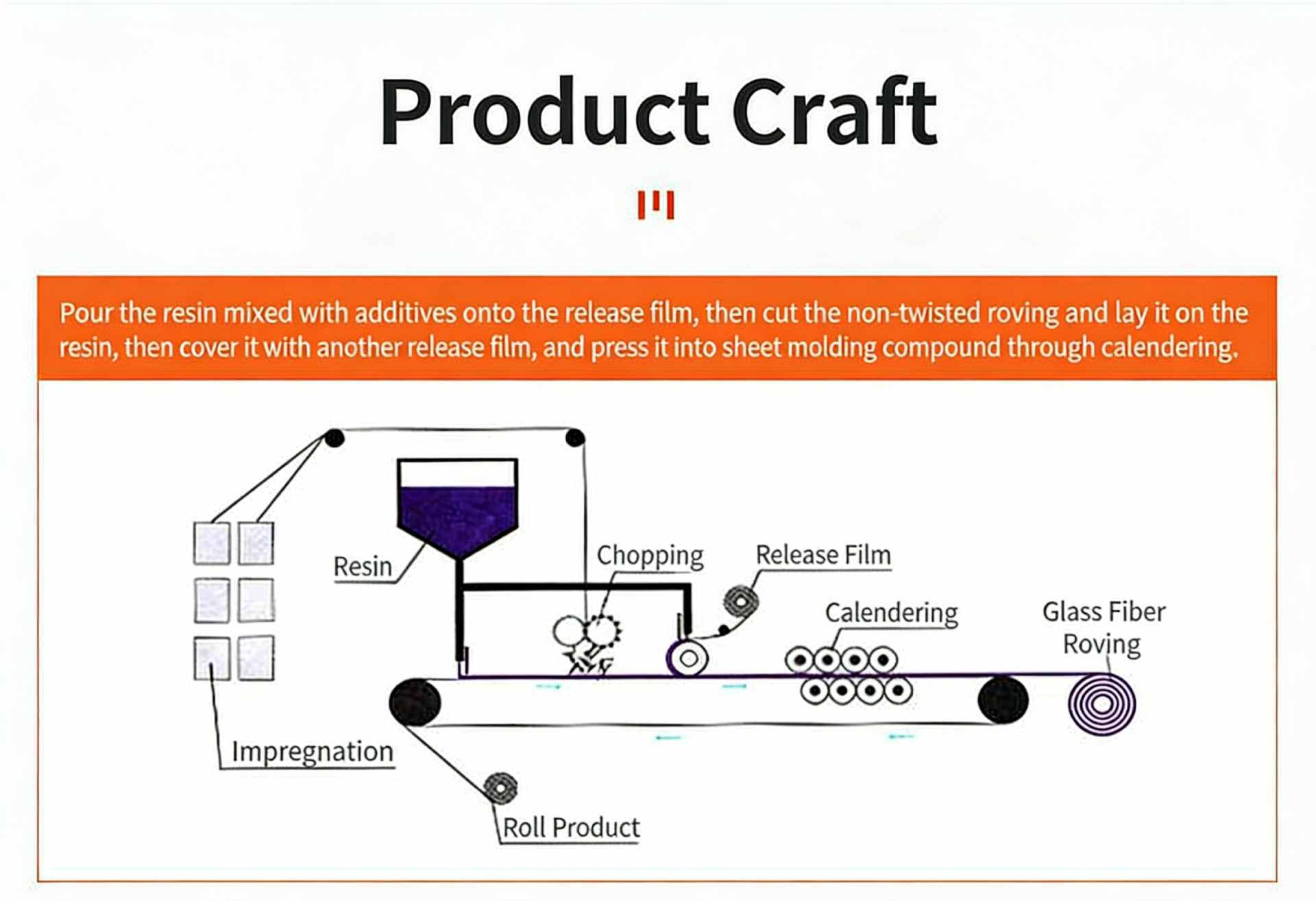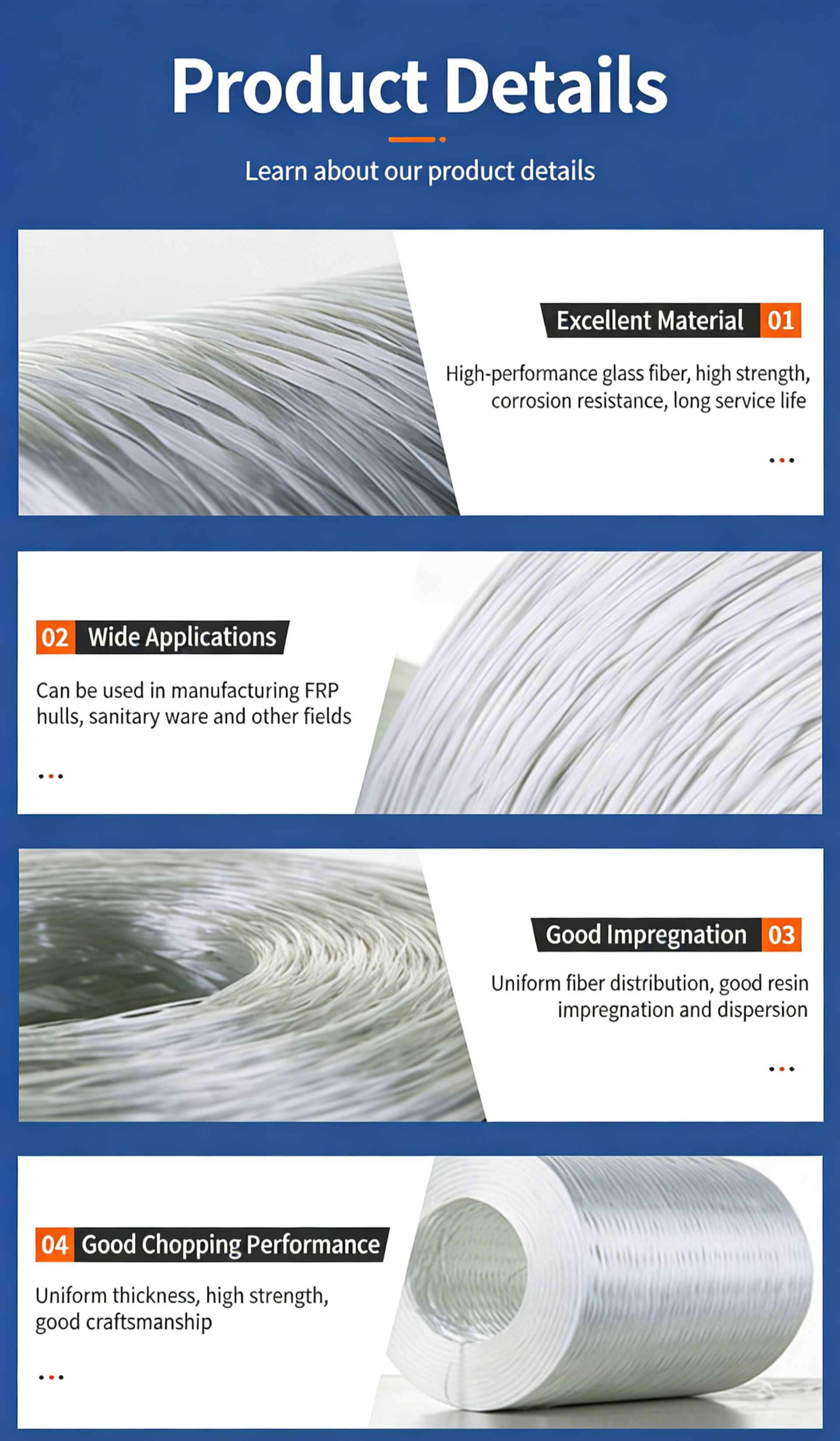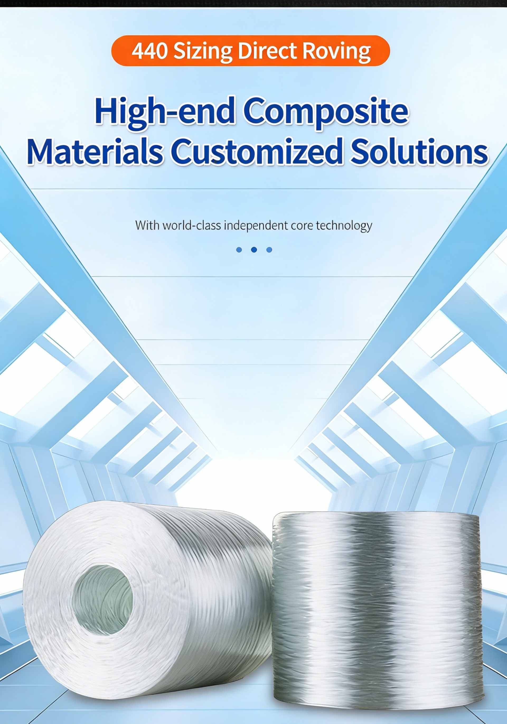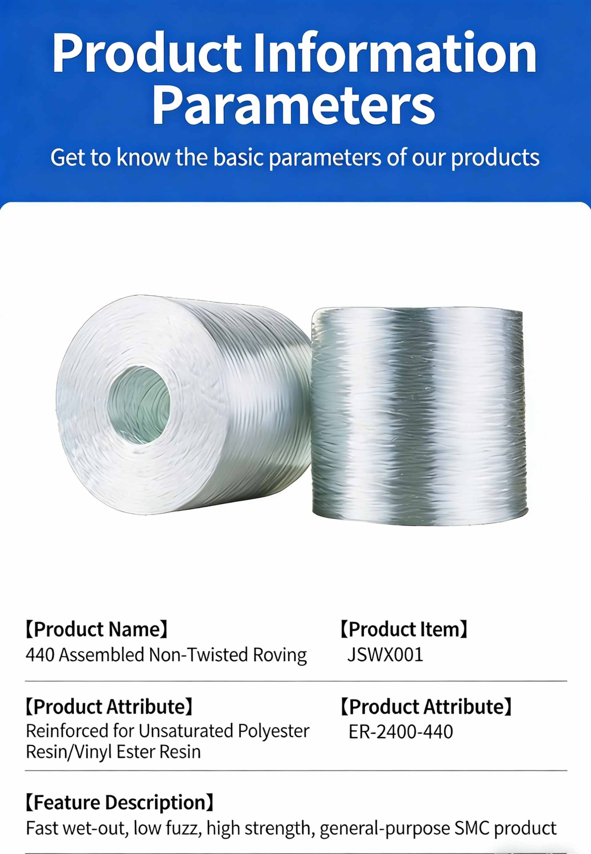 Product Name: 440 Ply Untwisted Roving (SMC Grade) Product SKU: JSWX001 Product Compatibility: Compatible with Unsaturated Polyester Resin / Vinyl Ester Resin systems, engineered for Sheet Molding Compound (SMC) manufacturing. Product Specification: ER-2400-440 Key Features & Benefits 1.Universal SMC Grade: A general-purpose roving specifically formulated for Sheet Molding Compound (SMC) production, designed to meet the core reinforcement needs of standard applications. 2.Rapid Resin Impregnation: Fast resin wet-out rate ensures quick and thorough penetration into the fiber structure, reducing processing time and improving the quality of the final composite. 3.Minimal Fuzz & High Strength: Low fuzz generation during processing, combined with high tensile strength, contributes to consistent product quality and enhanced mechanical performance of the finished parts.