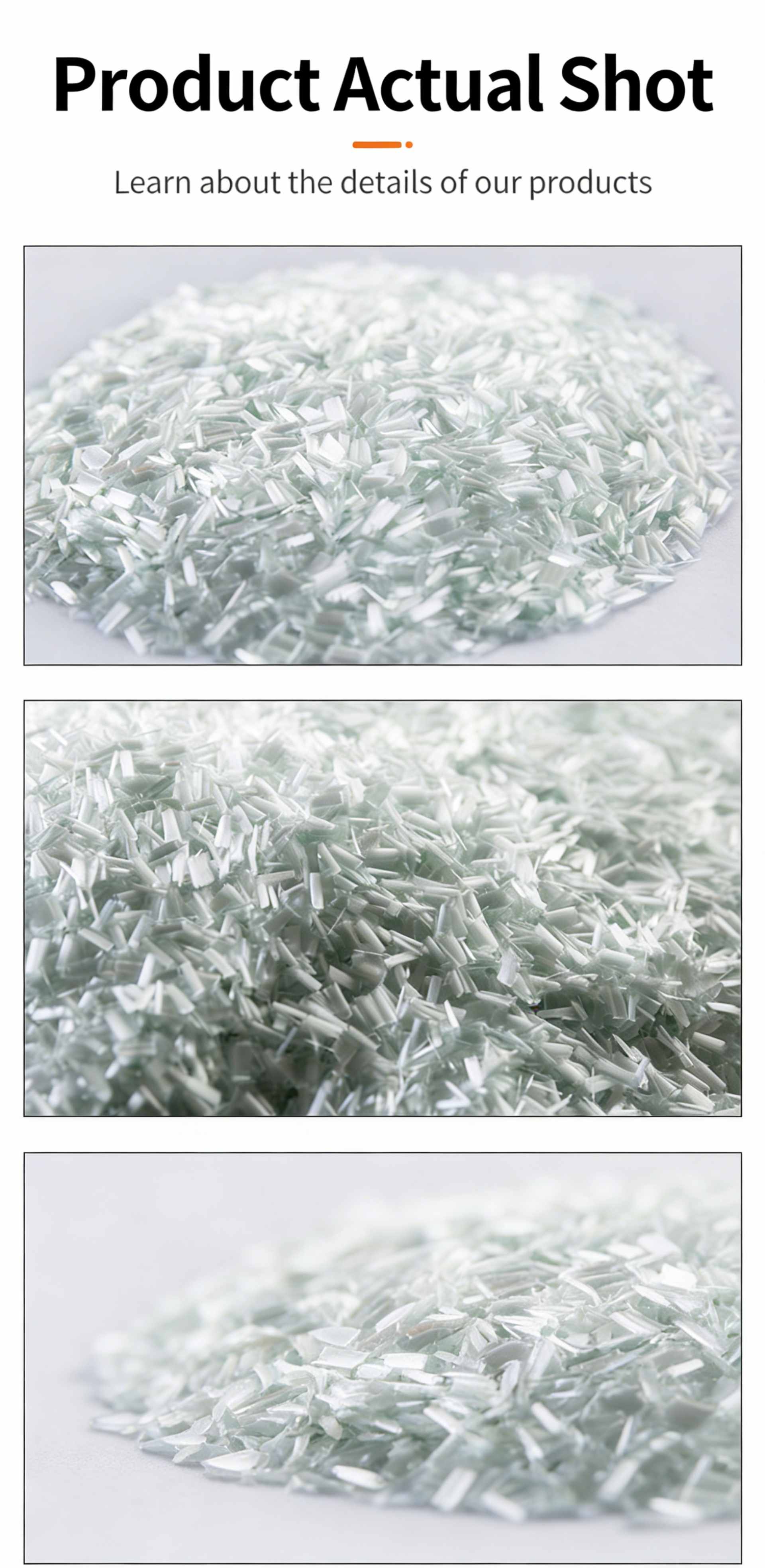 Product Name: 560A Short Cut Virgin Glass Fiber Powder Product SKU: JSWX019 Product Compatibility: High-performance reinforcing agent specially engineered for PA6 and PA66 thermoplastic resins, ideal for plastic modification and composite material manufacturing. Product Specification: ECS10-03-560A Key Features & Benefits Universal Compatibility: As a general-purpose grade, this 560A short cut virgin glass fiber powder delivers exceptional compatibility with both PA6 and PA66 resins, ensuring seamless integration into various plastic processing formulations 🏭. Superior Mechanical Enhancement: Infused with high-modulus E-glass fibers, it significantly boosts the tensile strength, stiffness, and structural rigidity of finished plastic components, meeting the rigorous demands of industrial applications 🛠️. Excellent Processability: Features low static generation, minimal fuzz, and superior fluidity during extrusion and injection molding, facilitating uniform dispersion within the resin matrix for consistent part quality ✨. High Surface Quality: The optimized silane sizing system promotes excellent interfacial bonding with resins, resulting in smooth surface finishes and reduced warpage of molded parts 🎨.