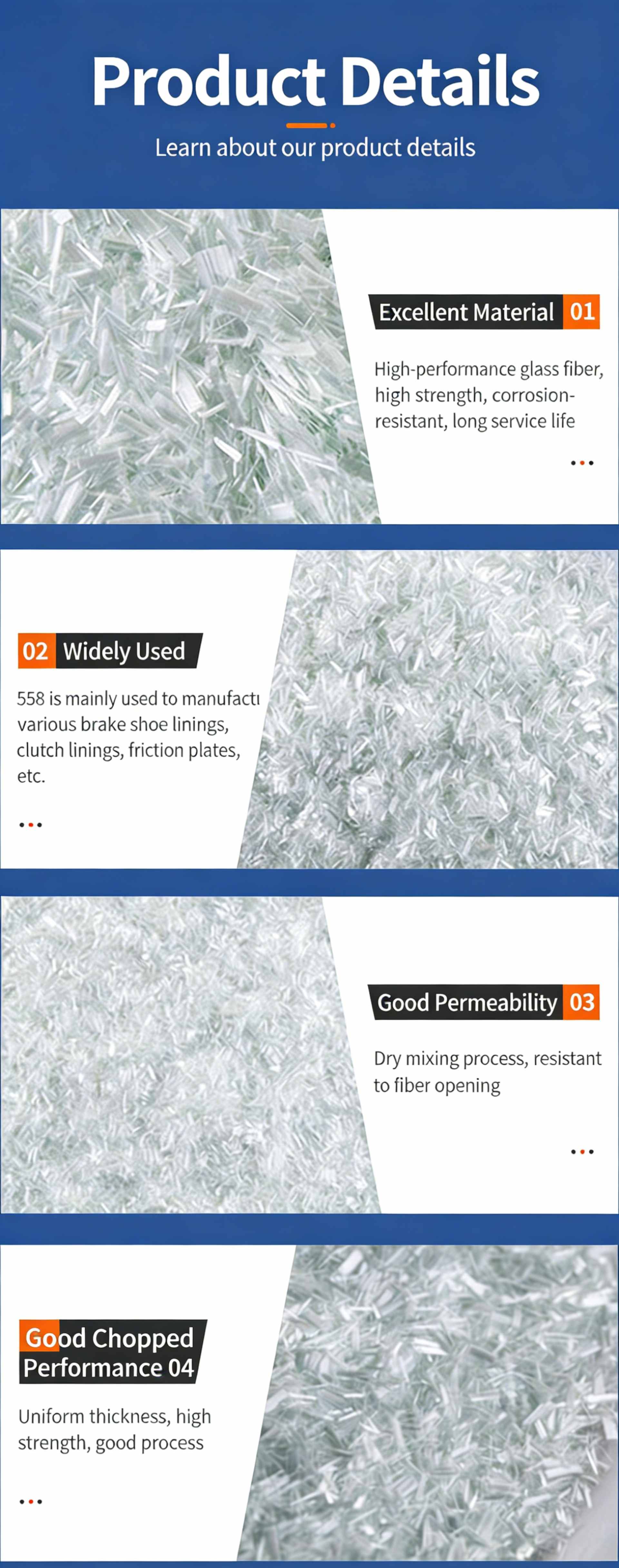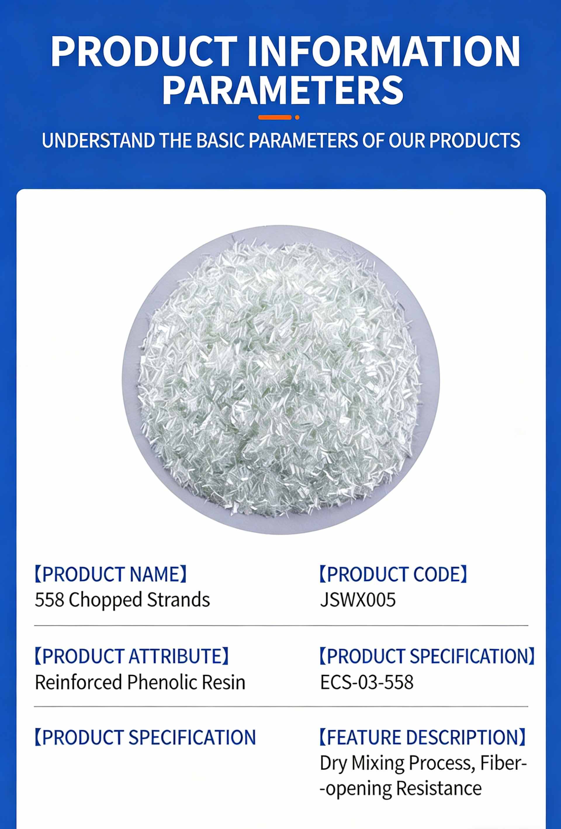 Product Name: 558 Chopped Strands Product SKU: JSWX005 Product Compatibility: Reinforced phenolic resin, engineered for applications requiring high fire resistance and structural integrity, ideal for building interior wall anti-cracking and friction-resistant composite materials. Product Specification: ECS-03-558 Key Features & Benefits 1.Reinforced Phenolic Resin Compatibility: Specially formulated to integrate seamlessly with phenolic resin systems, providing robust reinforcement for fire-resistant and high-temperature applications 🔥. 2.Anti-Cracking Performance: Designed to effectively prevent cracking in building interior walls, enhancing the structural stability and durability of construction materials 🏗️. 3.Fiber-opening Resistance: Utilizes a dry mixing process to deliver excellent fiber-opening resistance, ensuring uniform dispersion and consistent performance in end-use products ✨. 4.Friction & Fire Resistance: Inherently offers superior friction resistance and fire retardant properties, making it suitable for demanding industrial and construction scenarios where wear resistance and fire safety are critical 🛡️. Consistent Quality: Maintains stable processing characteristics, supporting reliable production outcomes for composite and building material manufacturing 📊.