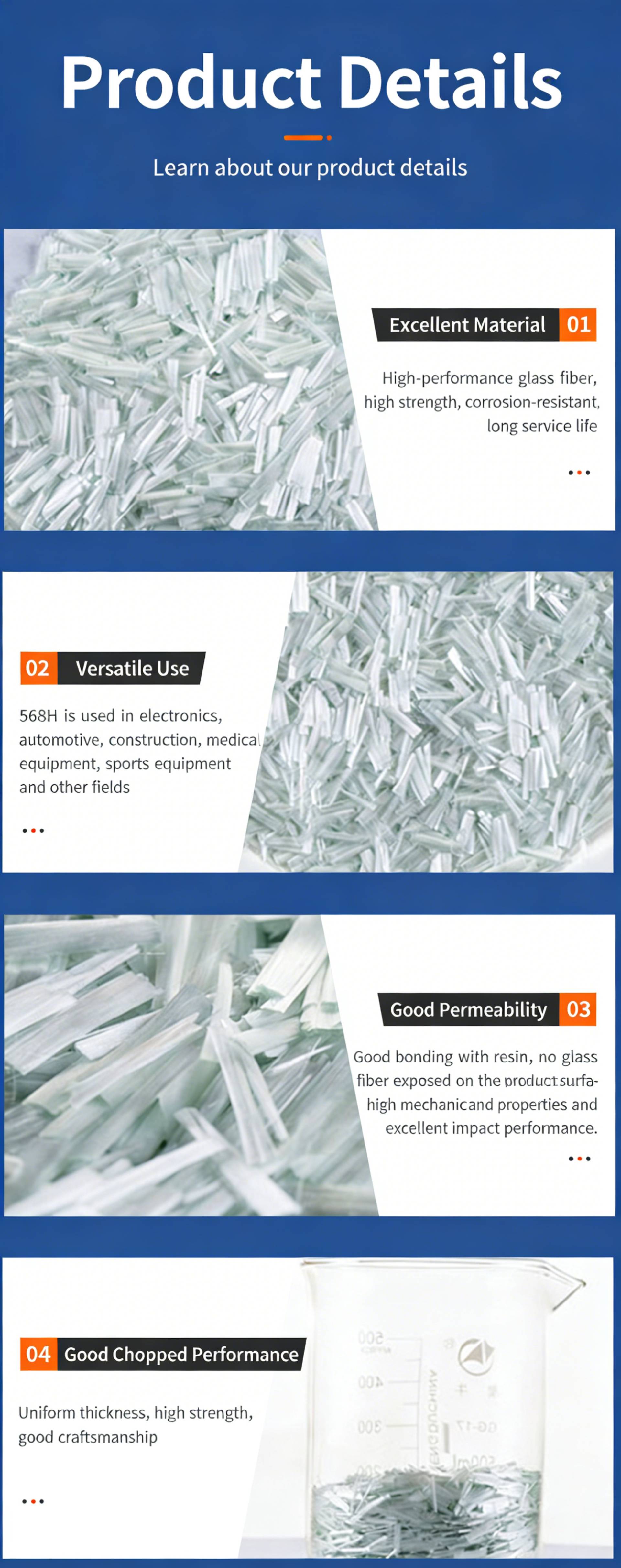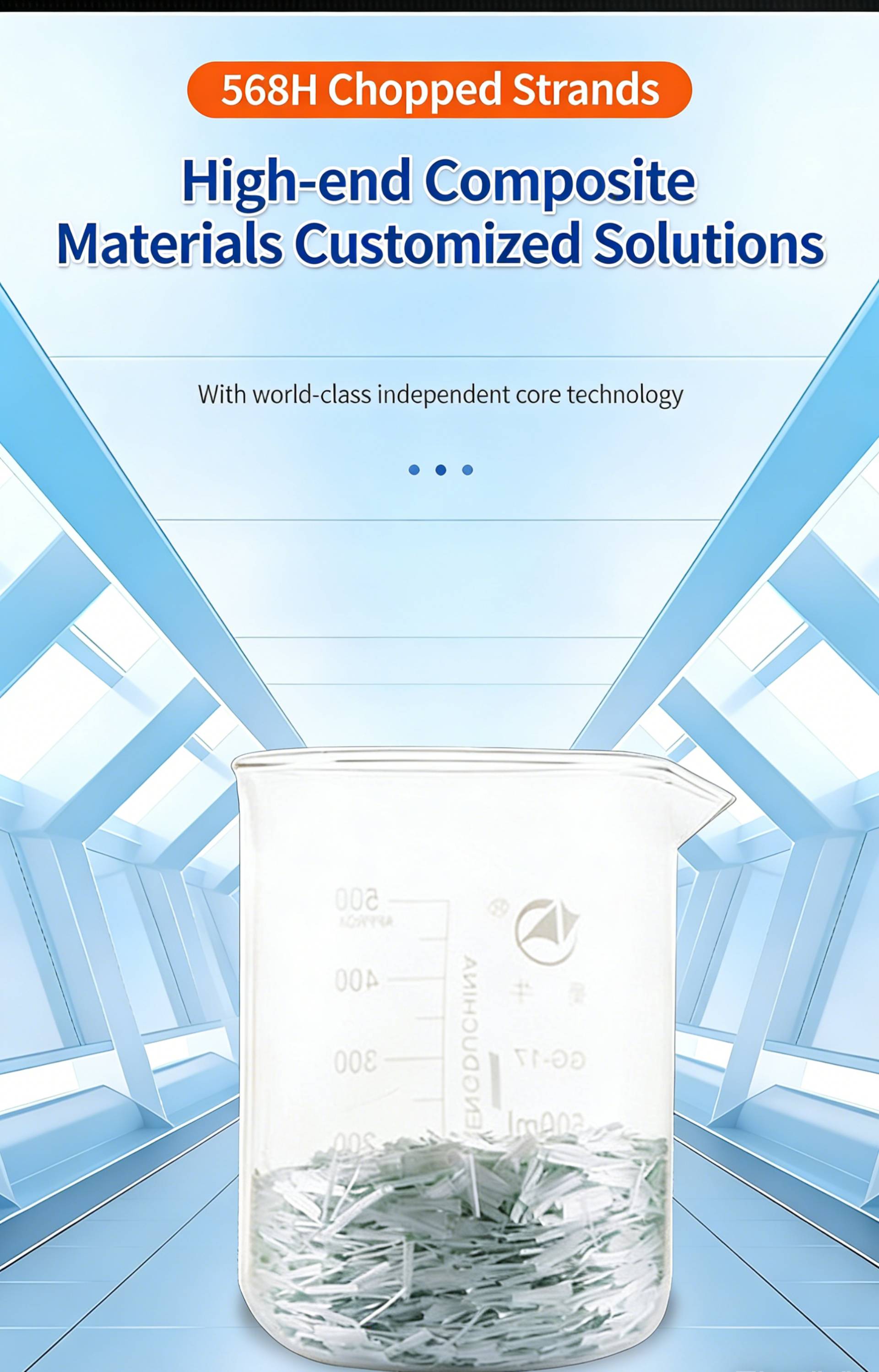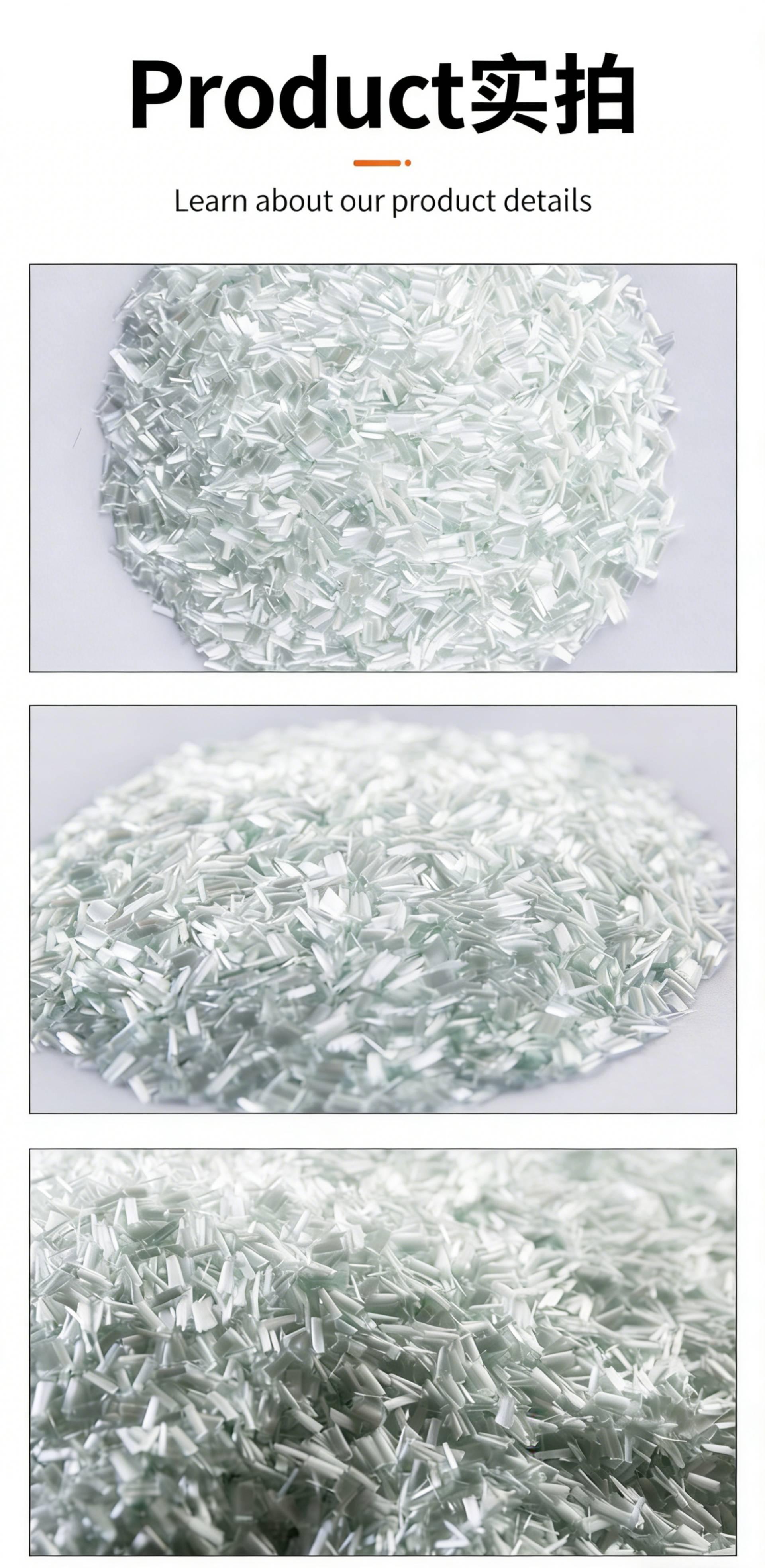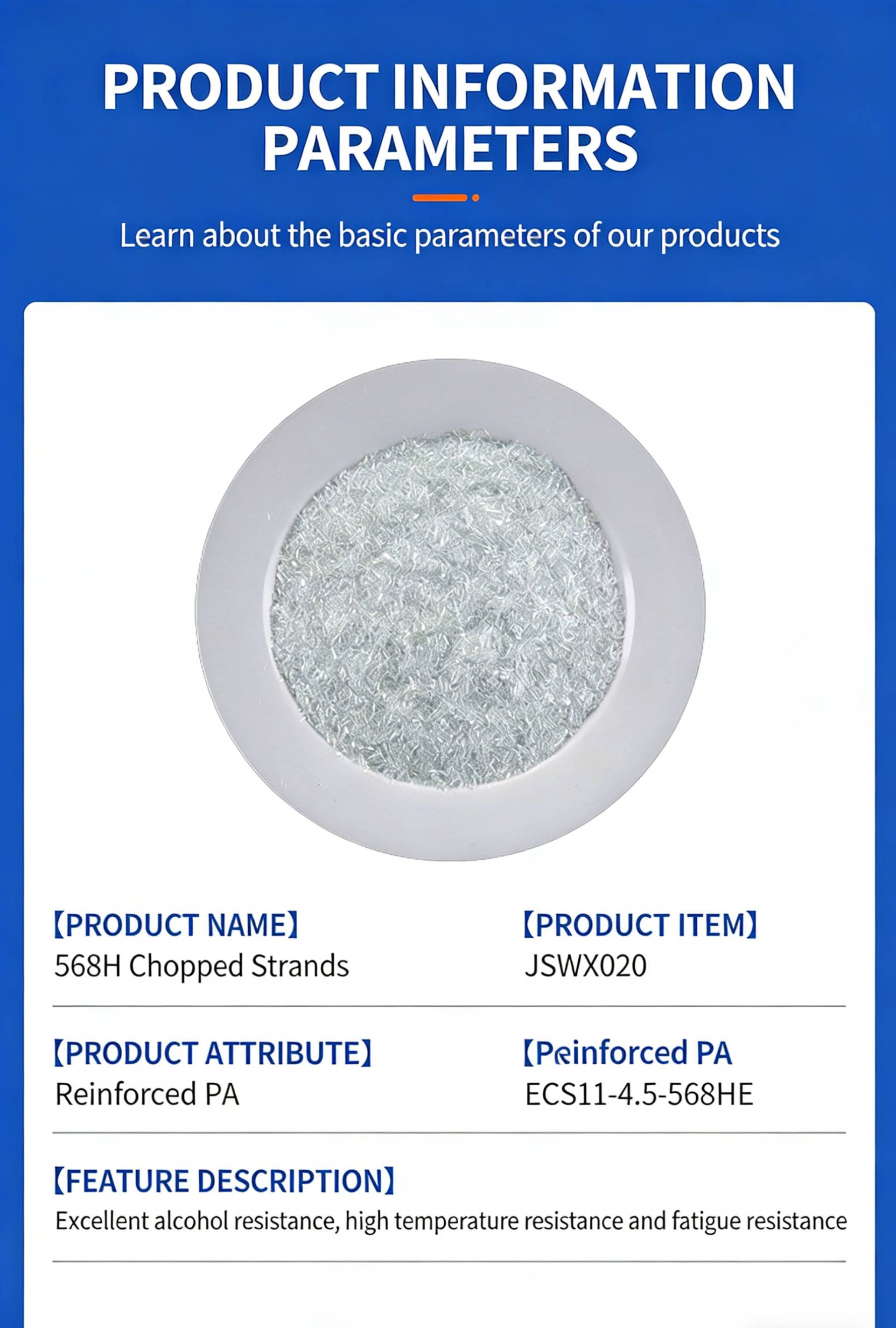 Product Name:568H Chopped StrandsProduct SKU:JSWX020 Product Compatibility:Reinforced PA, engineered for applications requiring excellent alcohol resistance, high temperature resistance and fatigue resistance, ideal for composite material manufacturing that demands reliable thermal and mechanical performance.Product Specification:ECS11-4.5-568HE Key Features & Benefits 1.Reinforced PA Compatibility: Specially formulated to integrate seamlessly with polyamide (PA) resin systems, delivering reliable reinforcement for composite materials that need robust performance under harsh conditions 🔥. 2.Excellent Alcohol Resistance: Provides outstanding resistance to alcohol environments, maintaining material integrity and performance in chemical exposure scenarios ✨. 3.High Temperature Resistance: Performs reliably under elevated temperature conditions, preserving mechanical properties and structural stability in high-heat applications 🛡️. 4.Superior Fatigue Resistance: Enhances the fatigue life of composite components, ensuring long-term durability and consistent performance under repeated loading 📊.